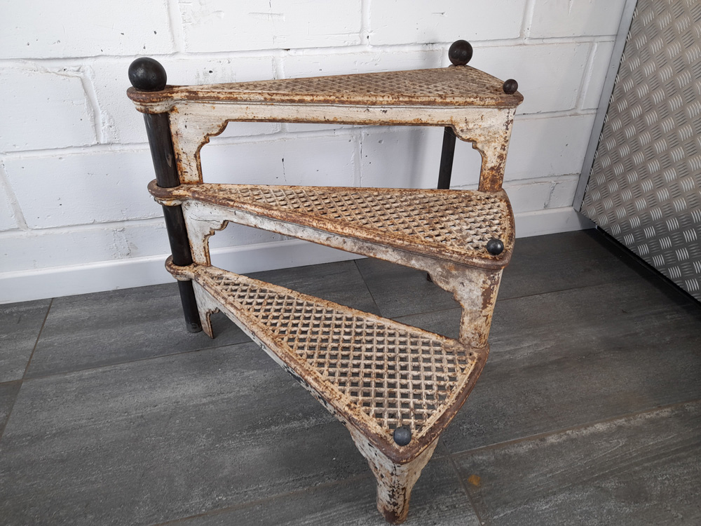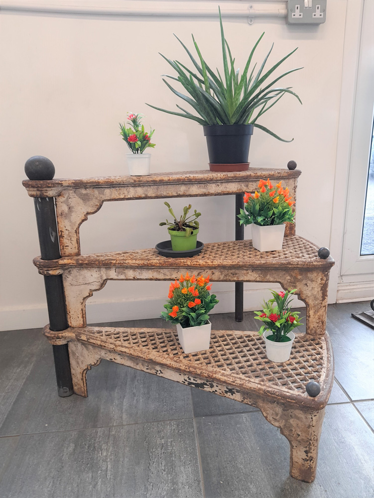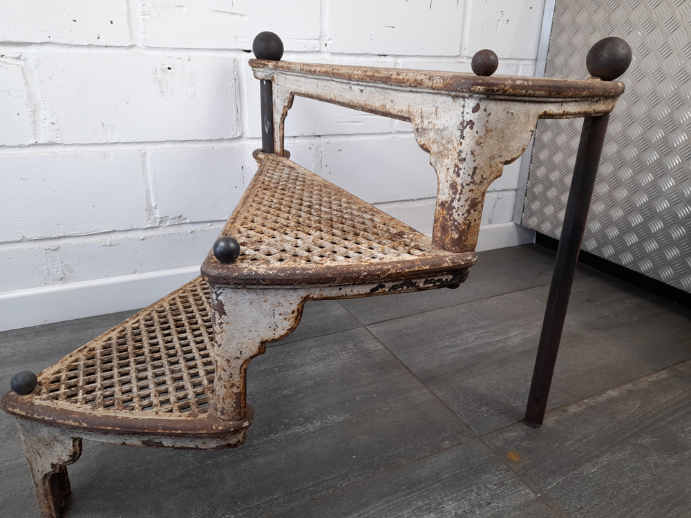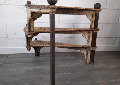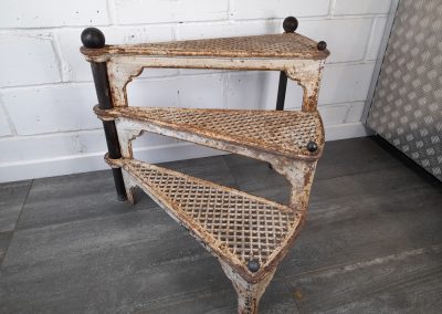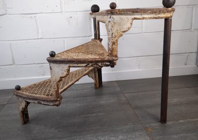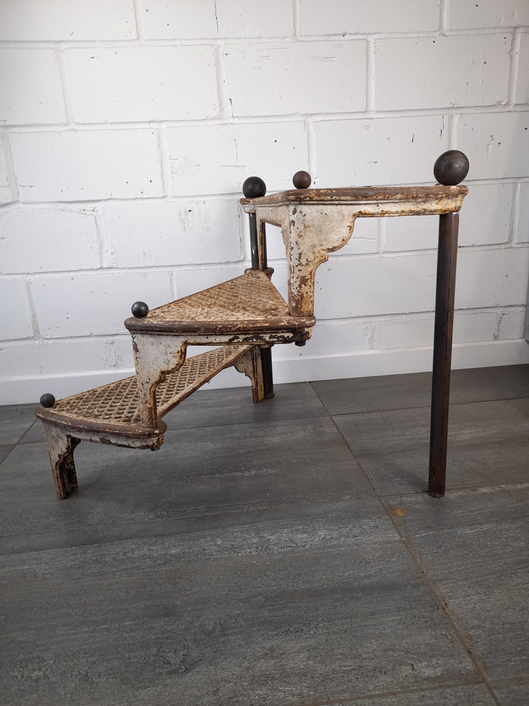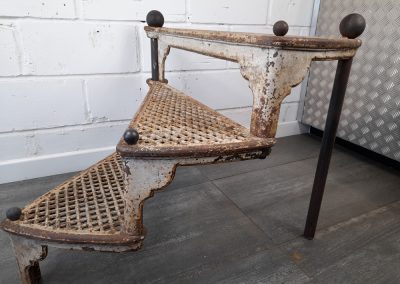 Fabricated using stairs treads from a Victorian metal staircase, with mild steel tube for the legs and ball decorations. Shown as self-coloured but can be shot-blasted and powder coated in a colour of your choice upon request