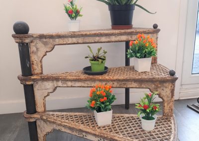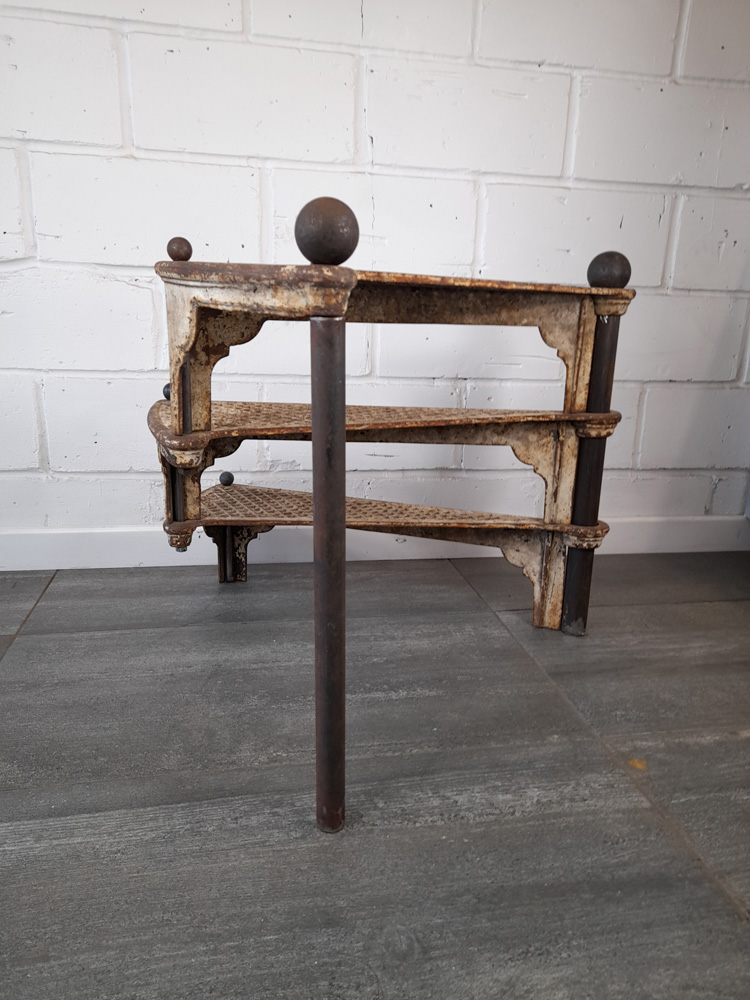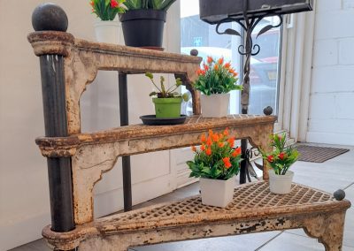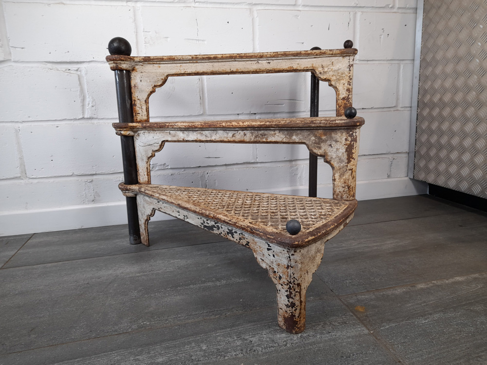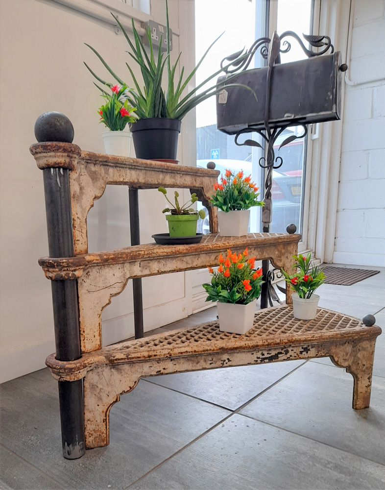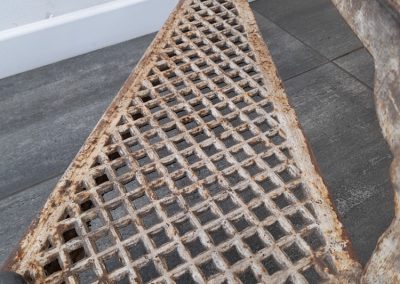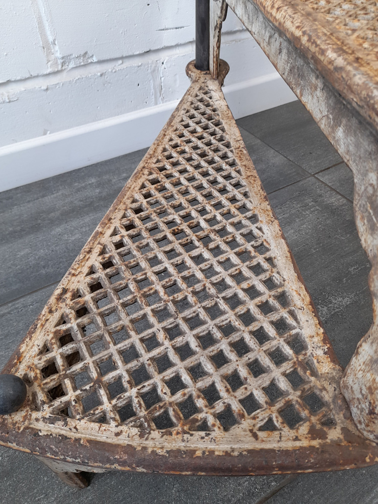 Fabricated using stairs treads from a Victorian metal staircase, with mild steel tube for the legs and ball decorations. Shown as self-coloured but can be shot-blasted and powder coated in a colour of your choice upon request