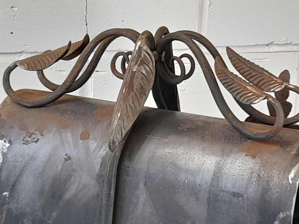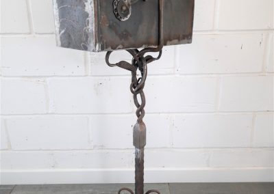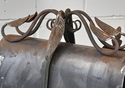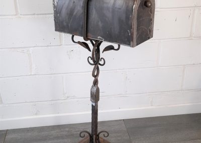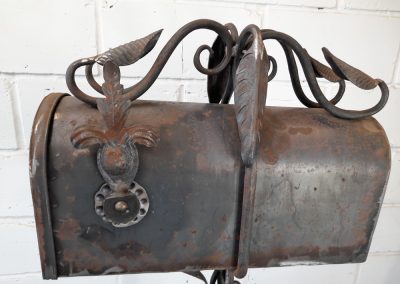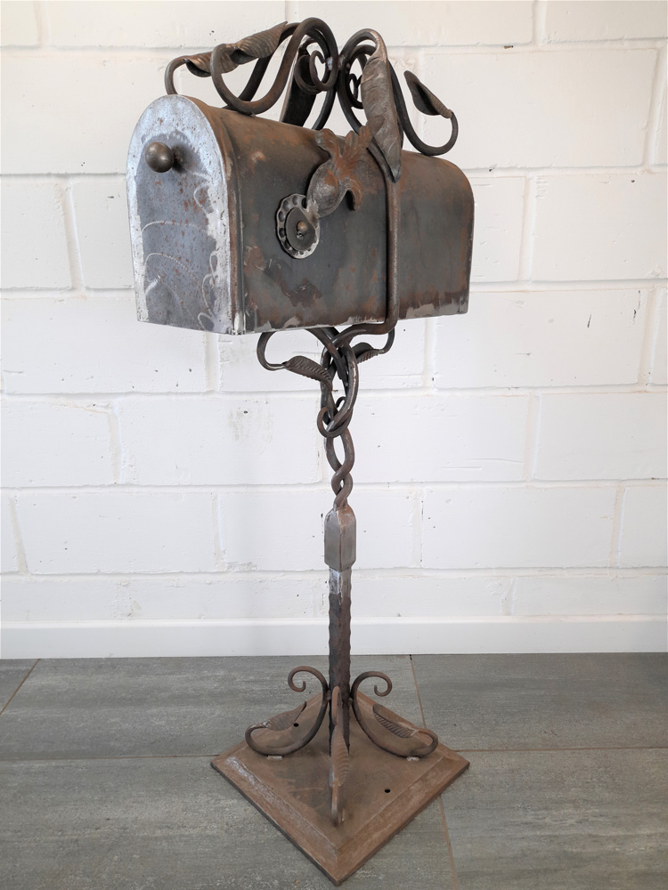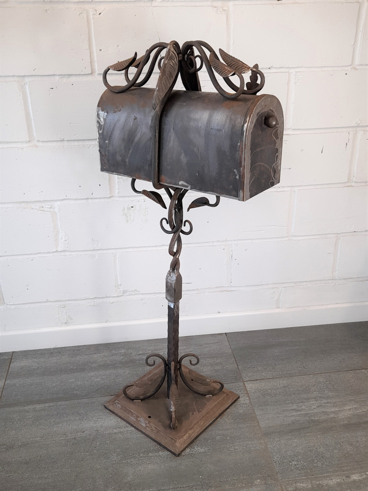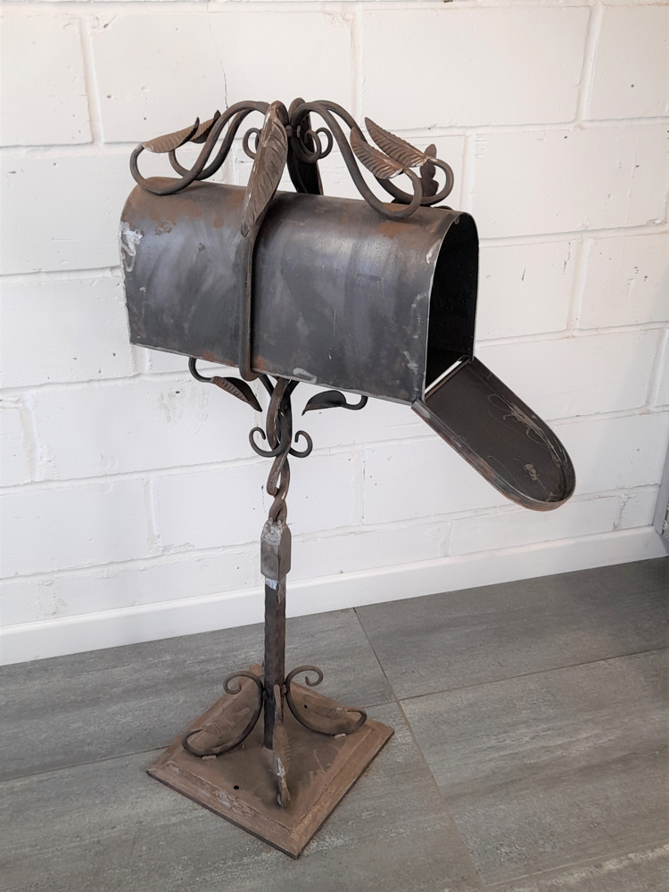 American style free standing post box with holes in base plate for bolting to the ground. Made from mild steel with leaf and vine decorations. Shown as self-coloured in photos but can be powder coated in a colour of your choice.