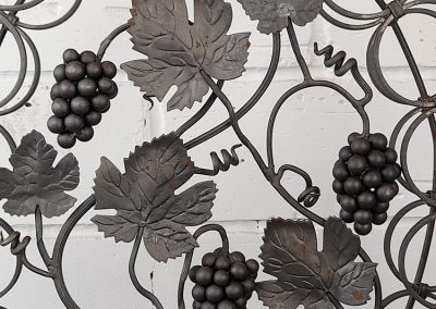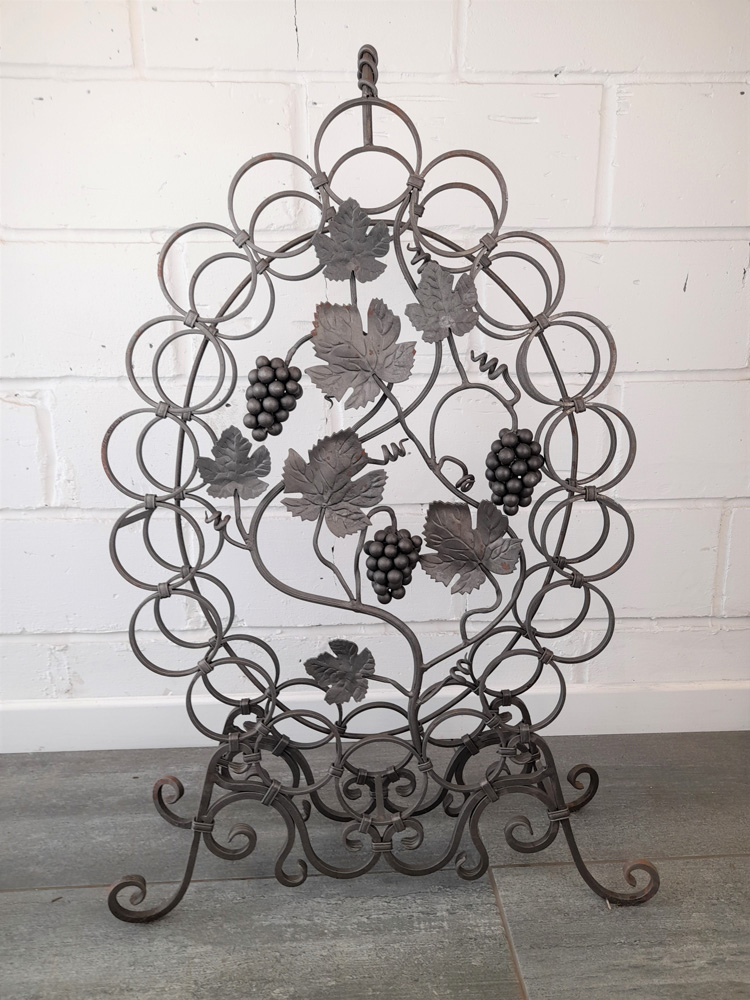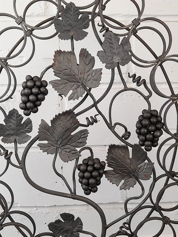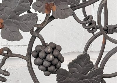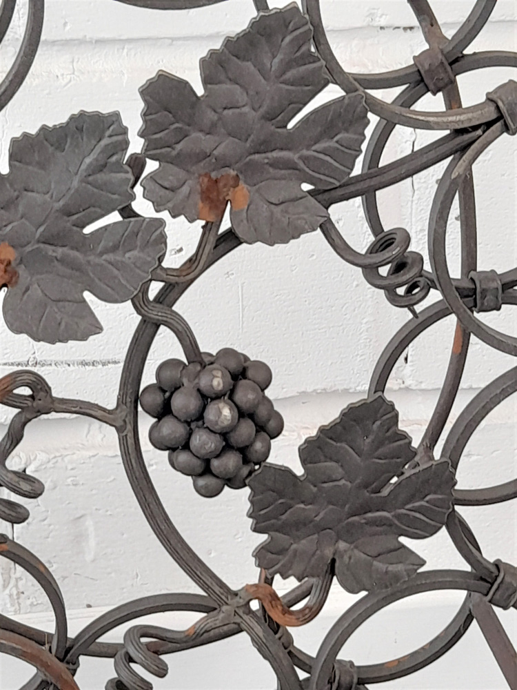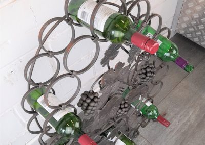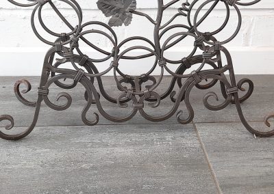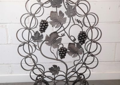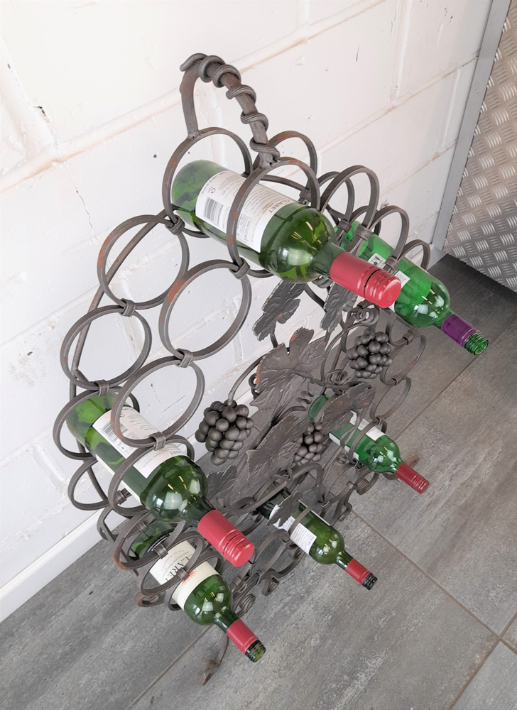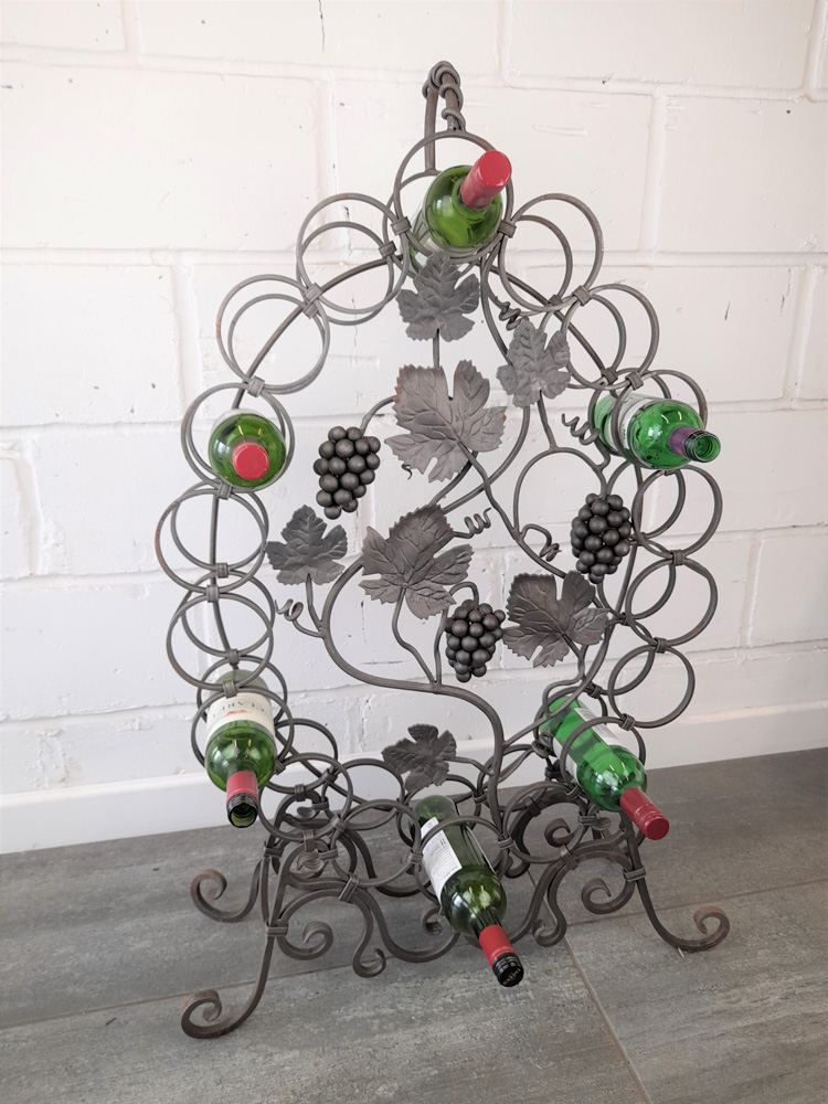 Made from mild steel with grape and vine decorative elements and holds 18 standard wine bottles. Shown as self-coloured but can be powder coated to a colour of your choice upon request.